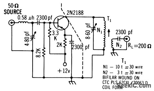 Circuit includes L-section to give generator resistance of 350 ohms from 50-ohm source. Power gain is13 db, noise figure 4 db, and bandwidth 5 Mc.-Texas Instruments Inc., Solid-State Communications, McGraw-Hill, N.Y., 1966, p 309.
