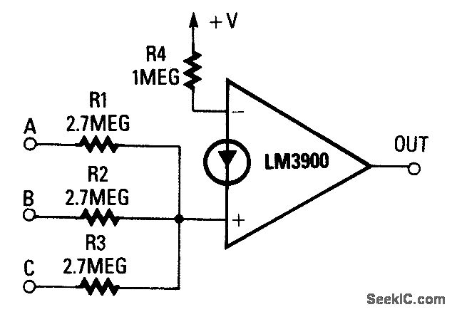 This circuit has high output onty when all three inputs are high. The noninverting-input current, when all three inputs are high, must exceed that of the inverting input, as determined by R4. The circuit can be converted to a NAND gate by transposing the two inputs of the op amp.