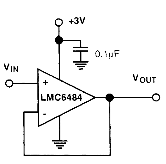 The LMC6484 provides a 3-V p-p rail-to-rail buffer with a +3-V supply commonly used for logic systems.