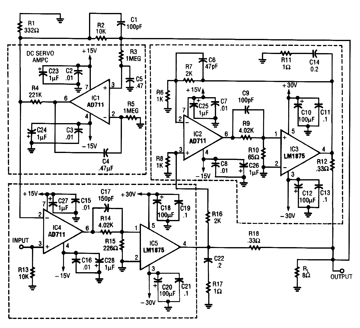This circuit uses two LM1875 devices and a dc servo loop. This circuit provides 40-W output. IC3 and IC5 must be heatsinked.