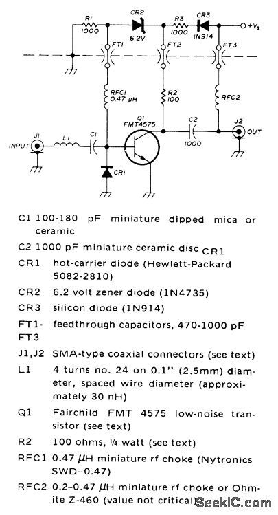 Uses Fairchild FMT4575 transistor having 1.25-dB noise figure, equaling performance of best paramps at 432 MHz. Input matching circuit is low-loss low-Q L matching section L1-CR1. Value of blocking capacitor C1 is not critical, but should be low-loss high-Q type, Hot-carrier diode CR1 in matching section adds about 0.75 pF to circuit, and serves also as low-loss limiter that protects transistor from excessive RF. Zener-diode biasing permits direct grounding of emitter, is insensitive to transistor current gain, provides some DC protection to transistor, and requires no adjustments.-J. H. Reisert, Jr., Ultra Low-Noise UHF Preamplifier, Ham Radio, March 1975, p 8-19.