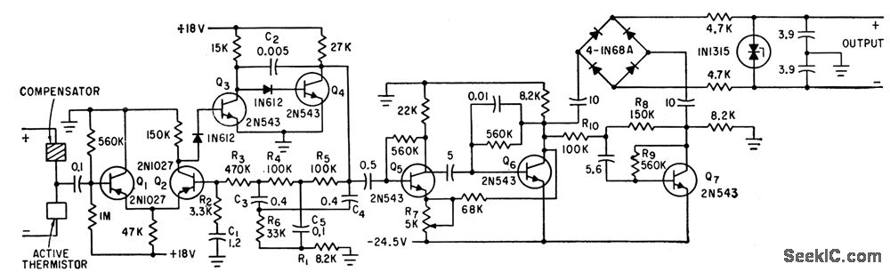 Uses differential input amplifier Q1-Q2 as part of four-stage direct-coupled front end of optically chopped radiometer. Parallel-T filter provides desired frequency characteristic and d-c path for negative feedback around direct-coupled amplifier.-F. Schwarz, Infrared Circuits in Tiros Satellites, Electronics, 34:38, p 43-45.