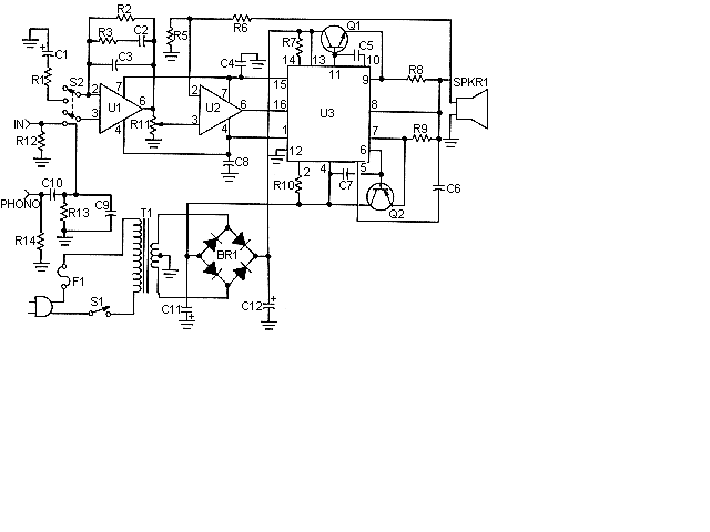 This is a handy, easy to build general purpose 50 watt amp. The amp has an input for a radio, TV, stereo or other line level device. It also has a phono input for a record player, guitar, microphone or other un-amplified source. With the addition of a low pass filter at the input, it makes a great amp for a small subwoofer.