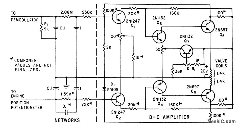 Two differential stages,Q1-Q2 and Q3-Q4,drive two emitter-followers Q5 and Q6 which in turn drive valve coils in pitch and yaw channels of autopilot.-J. H. Porter. Miniaturized. Autopilot System for Missiles.Electronics.33:43,p60-64