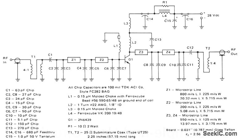 This 60-W, 28-V broadband amplifier covers the 225-400 MHz military communications band. The amplifier may be used singly as a 60-W output stage in a 225-400 MHz transmitter, or by using two of these amplifiers combined with quadrature couplers, a 100-W output amplifier stage can be constructed.The circuit is designed to be driven from a 50-Ω source and work into a nominal 50-Ω load. The input network consists of two microstrip L-sections composed of Z1, Z2, and C2 through CG. C1 serves as a dcblocking capacitor. A 4:1 impedance ratio coaxial transformer T1 completes the input matching network.L1 and a ferrite bead serve as a base decoupling choke. The output circuit consists of shunt inductor L2 at the collector, followed by two microstrip L-sections composed of Z3, Z4, and C8 through C11. C12 serves as a dc blocking capacitor, and is followed by another 4:1 impedance ratio coaxial transformer. Collector decoupling is accomplished through the use of L3, L4, C14, C15, C16, and R1.