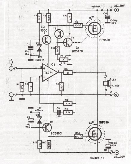 This simple power mosfet audio amplifier circuit, with TL071C and 2 MOSFETs (IRF9530 and IRF530) can deliver up to 45 Watts on 8 Ω speaker. This schematic is based on Siliconix application and on variations of voltage on the 2 resistors that are serial inserted on the voltage supplier of the operational amplifier driver. The MosFet transistor must be mounted on a heatsink with at least 1K/W.