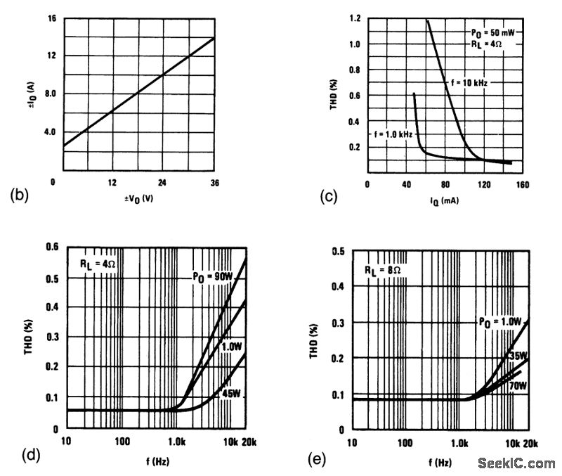 This circuit is capable of 90 W into a 4-Ω speaker, or 70 W into an 8-Ω speaker. The circuit features safe area, short-circuit and overload protection, harmonic distortion less than 0.1% at 1.0 kHz, and an all-npn output stage. Figures 1-42B through 1-42E show the circuit performance characteristics.