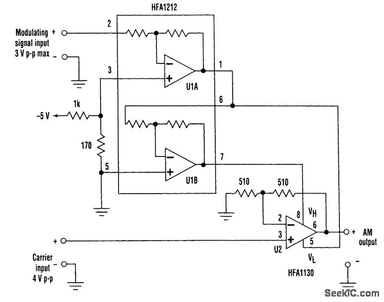 Limiting amplifiers also can be put to work in AM modulators. The fast overdrive recovery time and wide bandwidth of the clamp inputs allows these inputs to be driven by high-frequency ac, can as well as dc signals. When driven at the appropriate levels, the clamp inputs can be used to form an amplitude modulator. The HFA1130 limiting amplifier is driven by a 4-V p-p carrier signal. The gain of 2 through the HFA1130 ensures that the carrier amplitude is sufficient to drive the output over its±3.3-V range. The HFA1212 performs the necessary level shifting and inversion to convert the modulating signal input into a pair of antiphase signals that control the high and low clamp inputs. U1A inverts the signal and level-shifts to -1.5 V. U1B inverts that signal, forming a complementary signal centered at + 1.5 V. With a signal input of 0 V, U2 produces a 3-V p-p output at the carrier frequency. As the signal input varies, U2 produces a symmetrically modulated carrier with a maximum ampli-tude of6 V p-p. The 2300-V/μs slew rate of the HFA1130 limits 6-V p-p amplitude carrier signals to a frequency of 61 MHz. If adjusted for lower output-signal levels, the carrier and modulating frequencies can be increased to well above 100 MHz.