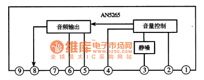 The AN5265 is composed of the electronic volume control circuit, the static noise control circuit and the audio output circuit.etc. The internal circuit block diagram is as shown in figure 1.