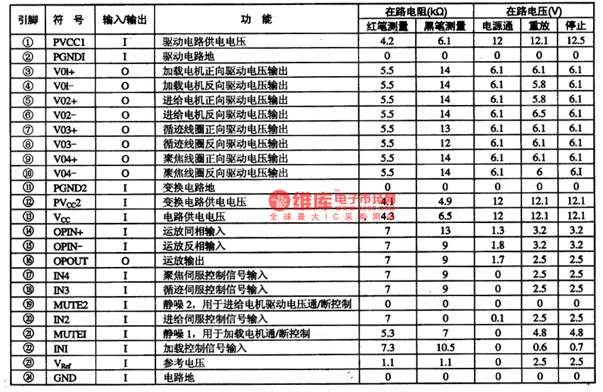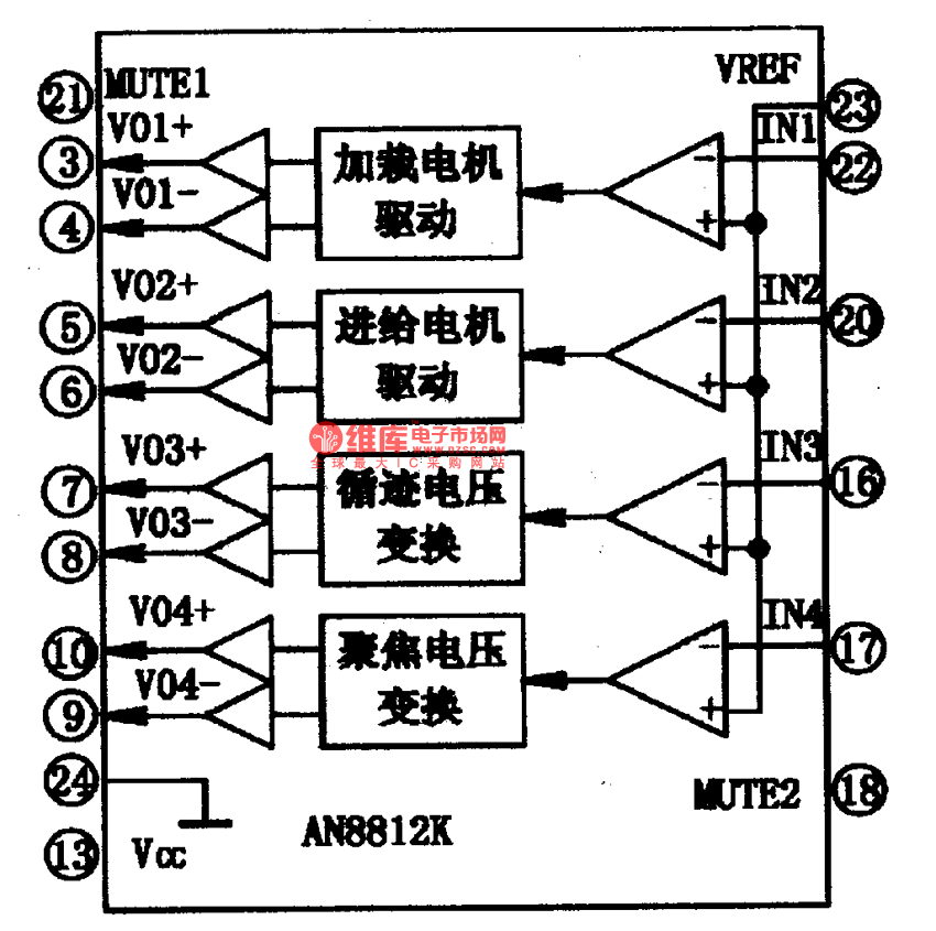 Figure 1 the internal circuit of AN8812K2.pin functions and dataAN8812K is in 24-lead dual line package, whose pin functions and data are listed in Table 1, the data come from tests on TCL DVD-250O.