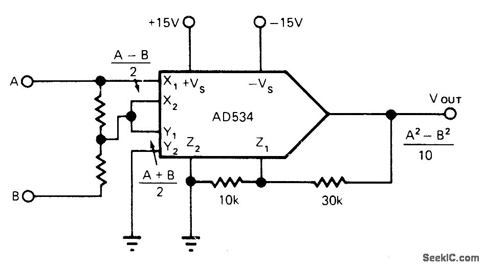 Transfer function Vour = (A2-B2)/10 is easily generated by AD534 analog multiplier.Differential inputs on Z terminals permit addition of feedback attenuator to decrease scale factor (or increase signal gain) from 40 to nominal value of 10. Feedback attenuation increases output offset proportionally; to make offset adjustment, connect 4.7-megohm resistor between Z1 and wiper of 50K pot connected across power supplies.-R. Frantz, Analog Multipliers-New IC Versions Manipulate Real-World Phenomena with Ease, EDN Magazine, Sept. 5, 1977, p 125-129.