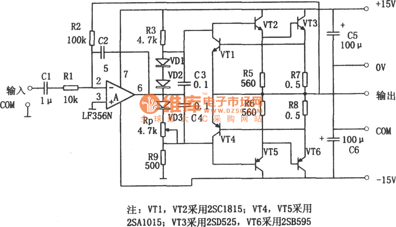 Shown in the figure,the circuituses on,under symmetrical structure and has two way signal which is added respectively to the two op-amp non-inverting input ends of LM1877,its output end’s external way is same with the input end: it uses 2.7 Ω resistor and 0.1 u F to form the high frequency filter circuit to prevent the high frequency of self-excited; coupling capacitor Co (470 u F) and load resistor ZL (loudspeaker:8Ω) concert the output power into voice to output, and the magnitude of Co and ZL circuit is also determined to the circuit’s lower-cut-off frequency fL,the relationship between this three is: fL=1/(2πZLCo),corresponding to the parameters in the figure,its fL = 42 Hz.