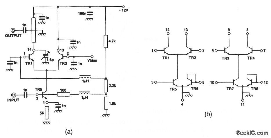 This circuit shows an SL2365 transistor array connected as a gain-controlled amplifier. The transistor-array connections are shown in Fig. 2-35B.The collector load of TR1 is a transformer that is composed of a 14-mm length of 75-Ω stripline resonated with a 1- to 6-pF variable capacitor. The transformer secondary is a small loop of stiff wire that is grounded at one end and located a few mm above the stripline. The noise figure at full gain is 9 dB.