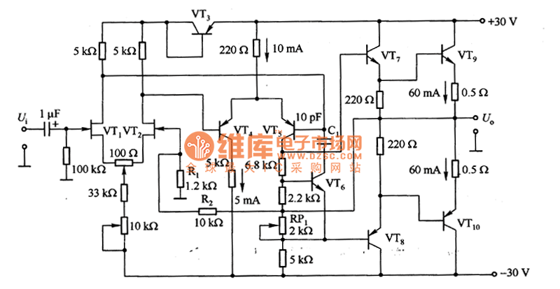 Picture 1 shows a FET audio amplifying circuit which demands small distortion, broad frequency bandwidth. The input terminal uses Knot type FET which can eliminate the influence to circuit caused by change of source voltage and current moving. DC stability is the main problem of direct-coupling DC amplifier which needs to use two level difference circuits. The first level difference circuit is formed by N channel FET, VT1 and VT2. The second level difference circuit is formed by PNP, VT4 and VT5, which has a high voltage amplitude of vibration and bigger distortion that should be paid attention during design.