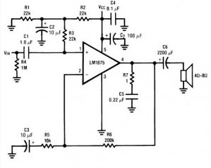 The following circuit uses LM1875 audio amplifier capable of delivering up to 30W RMS power into 8 ohm speakers with a total harmonic distortion (THD) 1%.
