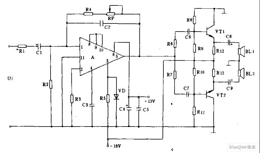 The Working principle is shown as above:input audio weak signal is amplified by amplifier A's 1 pin after capacitance cl coupling.The signal putout by @ pin and two parallel symmetrical, balance of power amplifier transistor VTl,VT2 emitters are in-phase output.In the circuit, c2, R4, RP form the negative feedback circuit to improve the stability of the output waveform.c3 is compensatory high frequency capacitor. C4, c5 are power supply AC component filter capacitors.Resistor R8 ~ Rlj are the bias resistors of transistor vTl,vT2. Low frequency end stand or fall depends on the capacity size of the output capacitors C8, c9 at the output end,meanwhile,it plays the every straight role,adjust potentiometer RP can adjustable gain up to 10dB or more.