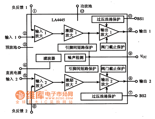 IC LA445 consists of dual-channel audio power amplifier circuit, short-circuit protection circuit, overvoltage protection circuit, surge suppressor circuit, and thermal cutoff circuit. It has various features, such as strong restraining capacity of ripple wave, high separating degree, good balance, and convenient assembling of radiator. It can constitute dual-channel or BTL power amplifier.
