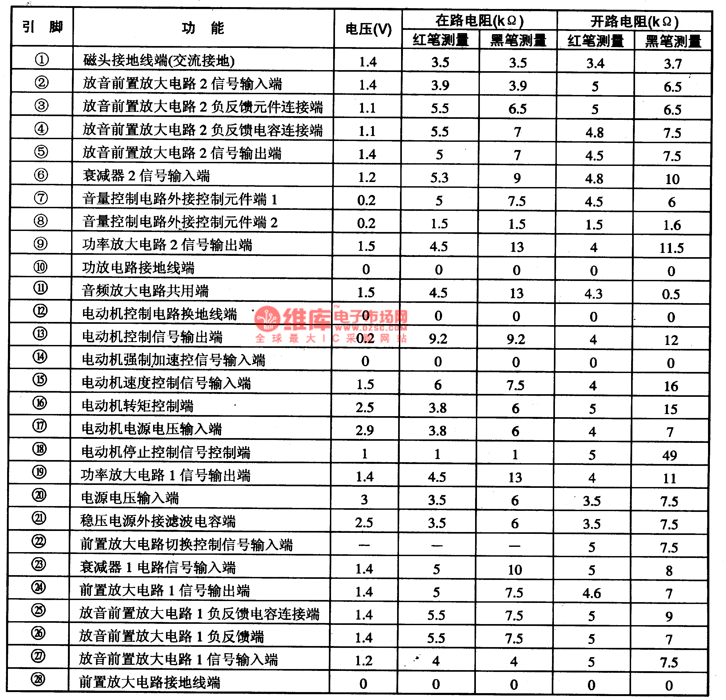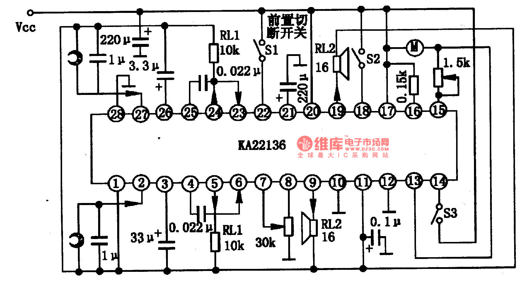 KA22135 is single chip stereo player integrated circuit produced by Samsung in Korea. 1.KA22135 inner circuit diagram and pin functions:KA22135 contains two fronted amplifiers, double power amplifier and electric DC volume control circuit and DC device speed regulator circuit.It has two packages. KA22136F is 28-pin dual line package and KA22136 is 28-pin dual-line flat package. They have the same inner functions and the inner circuit diagram is shown in the picture 1-1.2.KA22135 main parameters:Its work voltage converge is from 2.1 V to 5 V and the classic work voltage is 3 V. When Vcc is 3 V and RL is 32, its output power is 28 mW x 2.3.KA22135 classic applying circuitIts classic applying circuit is shown in the picture 1-2.