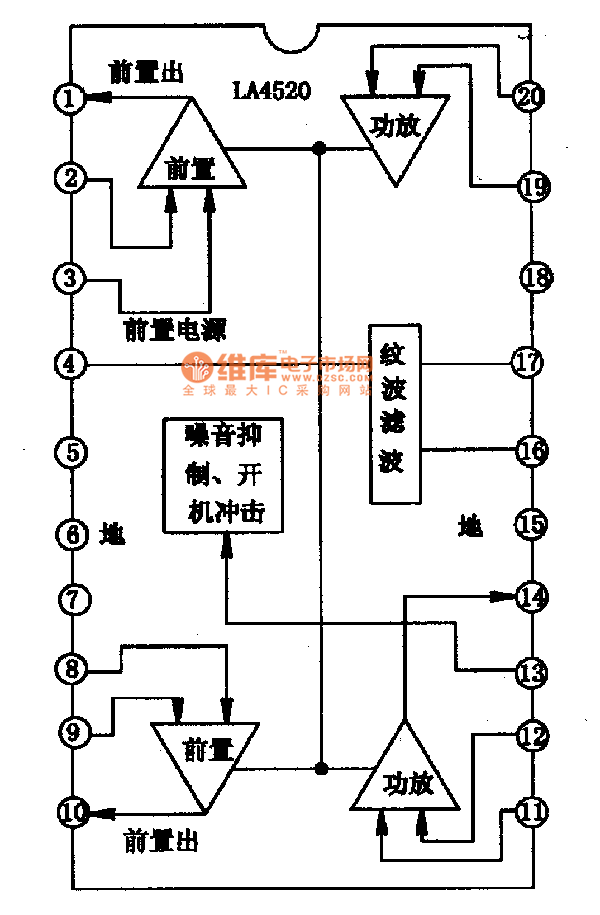 LA4520-Single chip stereo player integrated circuit diagram LA4520 is a single chip player integrated circuit. It is widely used in all kinds of players. LA4520 inner circuit diagram and pin functions:LA4520 inner circuit contains two similar playing fronted amplifier circuits, power amplifier circuits and so on. As picture 1 shows, this IC uses 20 pin dual line package and related information are shown in the picture. LA4520 classic applying circuit: the picture 2 shows its classic applying circuits.