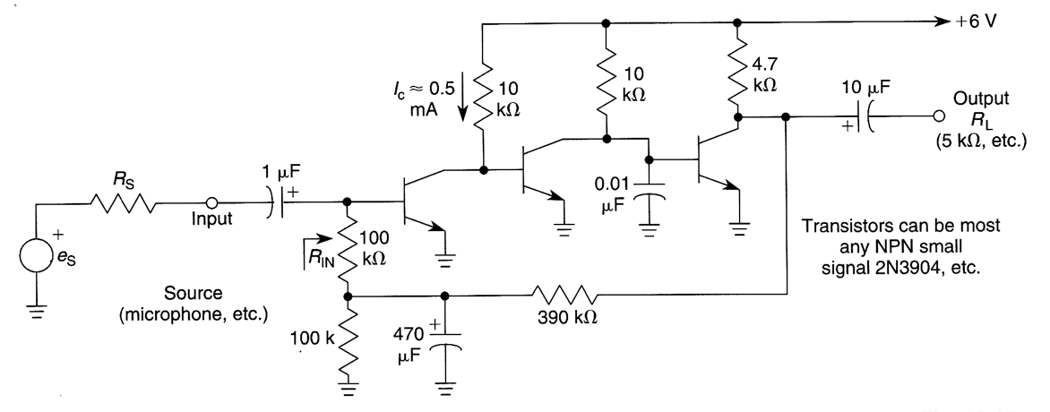 This amplifier has a very high gain in the audio range and is approximately the product of the current gains of the three transistors multiplied by the ratio of RL to (RIN+RS).RIN is approximately to: