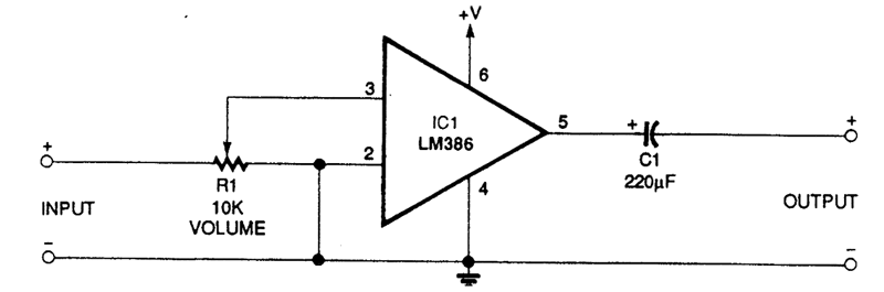 This circuit has a gain of about 20. A suitable power supply voltage is 5 to 12 V, depending on the desired audio output power level.