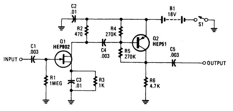 The use of a FET gives this amplifier a high input impedance. The bandwidth should be ade-quate for LW through HF use (dc-30 MHz), as an active antenna preamplifier.