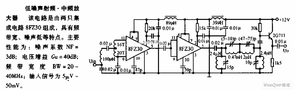 The circuit is composed of two 8FZ30 integrated circuits with wide frequency bandwidth, low noise. The main properties: voltage gain Gu = 40dB; bandwidth BW = 20 to 40MHz; input signal is 5μV to 50mV.