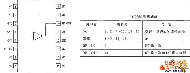 The RF2360 is a general purpose, low-cost, high-linearity RF amplifier IC, and is manufactured on an advanced gallium arsenideheterojunction bipolar transistor (HBT) process. It has been designed for using as an easily cascadable 75Ω gain block with a noise figure of less than 2dB. Gain flatness is better than 0.5dB from 5MHz to 1000MHz, and high linearity makes this part ideal for cable TV applications. Other applications are include IF and RF amplification in wireless voice and data communication products which operating in frequency bands up to 1000MHz. The device is self-contained with 75Ω input and output impedances providing less than 2:1 VSWR matching. RF2360 is featured in a SOP-16 squaredbatwing package, and its pinout is shown in the picture below.
