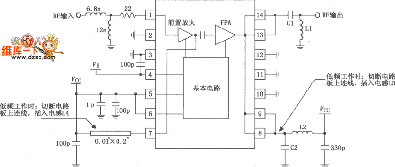 RF signal (RF) isinput by pin 1, enlarged by preamplifier and final power amplifier ( FPA), thenoutput by pin 14. There is a blocking coupling capacitor between pin 1 and preamplifier, so it does not need to add coupling capacitor. Output ends pin 8, 9, 13, 14 are connected inside of the chip. Normally, pin 13, 14 are connected outside to be uses the as signal output, which connects to the matching network to make the amplifier output resistance match with it, then it gets themaximum output power and efficiency; and pin 8, 9 are connectedoutsideto beas power supply end, when it works at 915MHz, it adds a filter capacitor C2(=2pF) to ground tomake up filter circuitwith second harmonic, which can shortconnect second harmonic effectively.