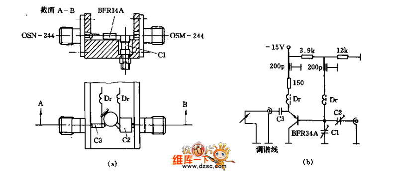 This circuit consists of transistor BFR34A,and the figure(a) shows its mechanical structure, when it worksat operating point, Uce=12V, Ic=17mA, theoutput power is12mW.Figure (b) is thebasic circuit. The collector's pins are grounded for better heatdissipation. The optimal phase condition of feedback between tmitter and collector isadjustedby coaxial wire. Variable output coupling capacitor is composed of the small thin plate with side length in5mm.