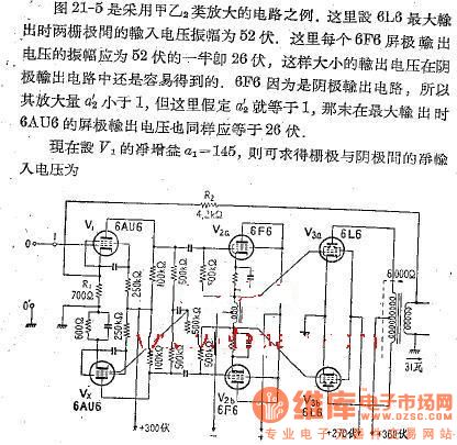 Figure 21-5 is an example of amplifier circuit using A,Ba. The maximum input voltage amplitude is 52V between two grids of 6L6. The output voltage of each 6F6 anode should be half of 52V, that is 28V, then the output voltage in cathode is easy to get. As 6F6 is cathode output circuit, the gain of a2 ' is less than 1. But if a2 ' is equal to 1, then the maximum output voltage 6AU6 is also equal to 26V. Now setting the gain a1 of V1 is equal to 145, you can find the net between the gate and the cathode input voltage.