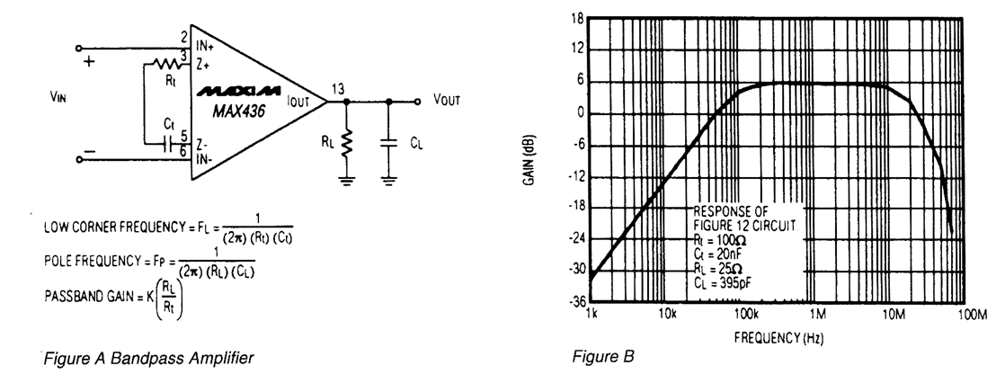 The circuit A is a bandpass amplifier,with the low corner frequency set by the impedance of the transconductance network,The high corner frequency IS set by the impedance ofthe RC network atthe amplifier output The passband gatn is (k)x (R1/RT). Figure B is a plot ofthe circuit in Figure A,with Rt=100Ω,Ct=20nF,R1=25Ω,and C1=395pF.
