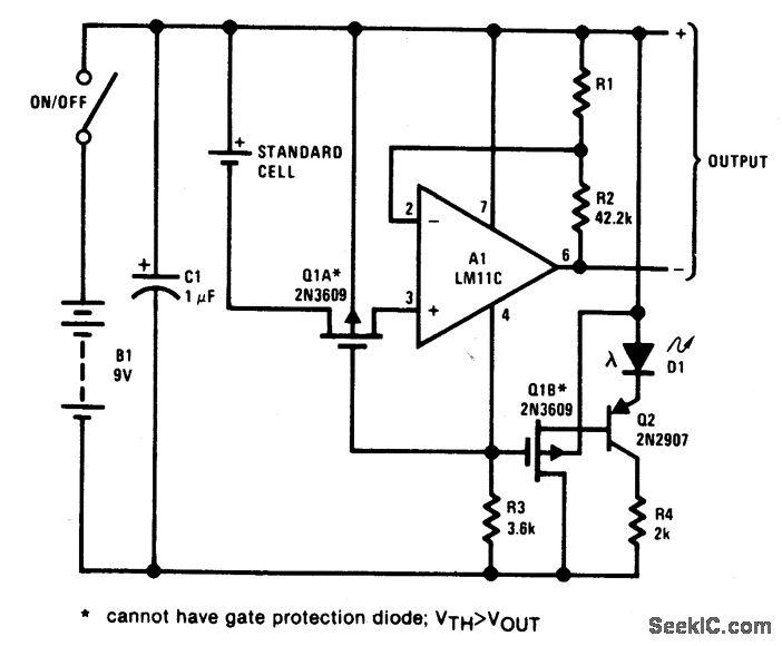 This circuit has negligible loading and disconnects the cell for low supply voltage or overload on output. The indicator diode extinguishes as disconnect circuitry is activated.