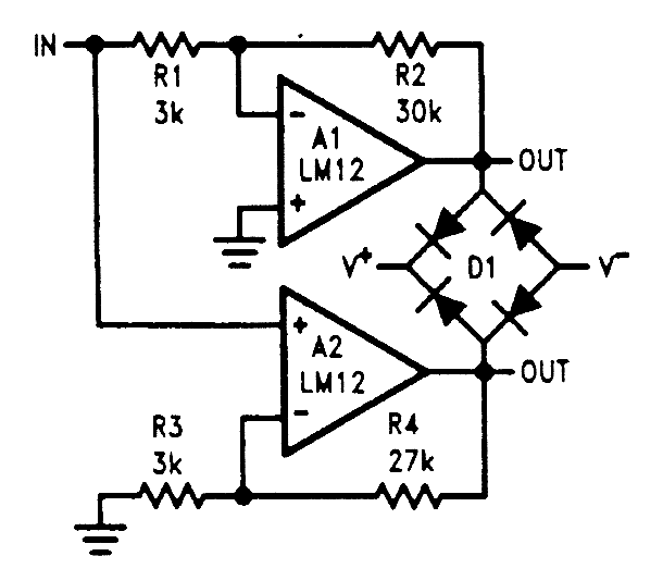 These bridge connections provide differential outputs that approach twice the total supply voltage. Diode bridge clarnps output to the supplies.
