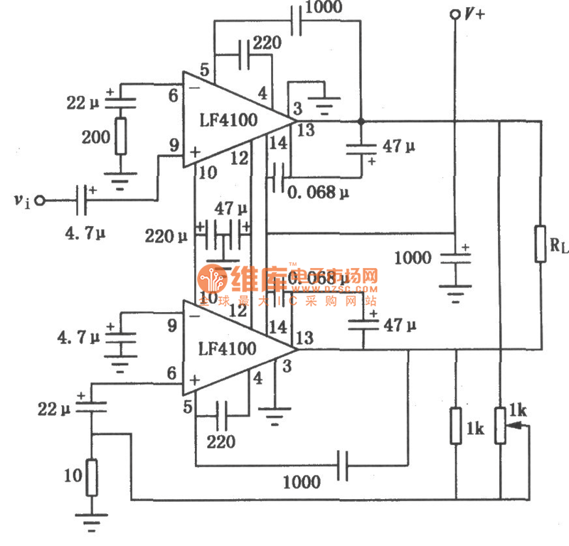 LF4100, 4101 and 4102 are mainly used for tape recorders, amplifiers and other electronic equipment of audio power amplifier. The device has a wide frequency response, high fidelity, high stability and the feature of easy to adjust stc. BTL power amplifier circuit composed of LF4100, 4101 and 4102 is shown as above.