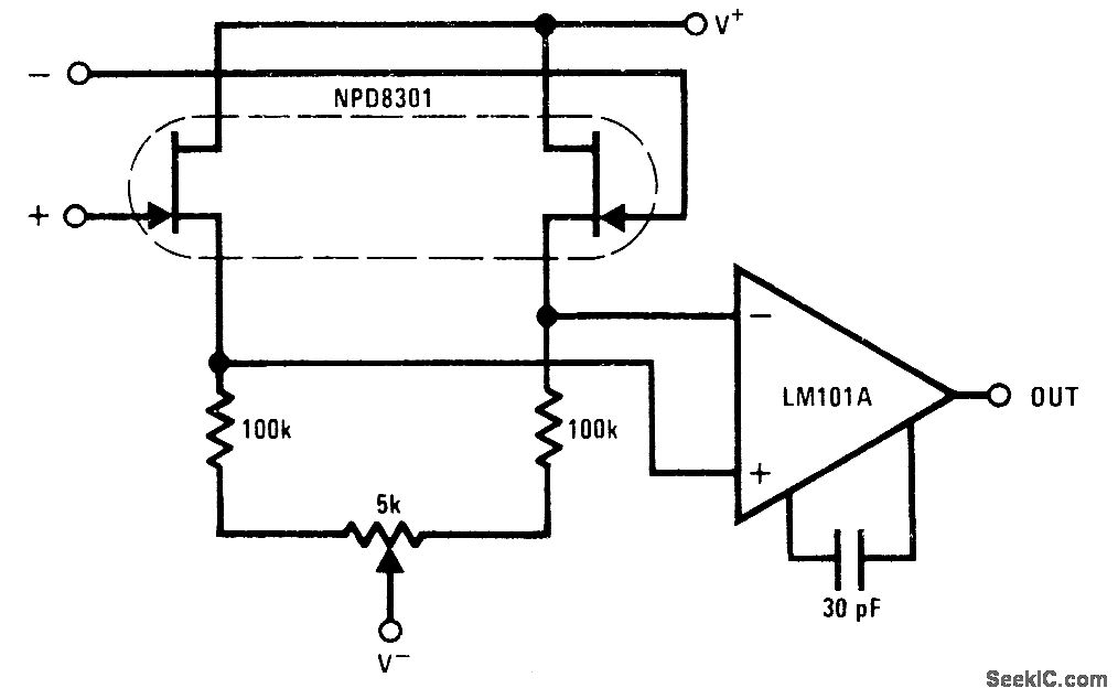 NPD8301 dual FET is ideal low-offset low-drift buffer for LM101A opamp. Matched sections of FET track well over entire bias range, for improved common-mode re jec-ion.- FET Databook. National Semiconductor. Santa Clara. CA. 1977. p 6-26-6-36.