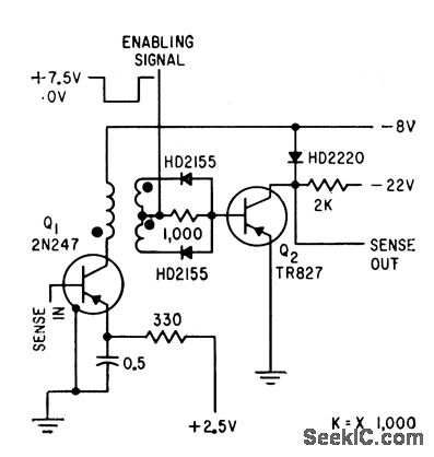 Uses coincident-current technique. Full-wave rectifier is required at secondary of transformer because sense output can be of either polarity. Enabling signal turns on sense amplifier, to permit discrimination between memory core outputs during unload and load cycles.-D.Haagens, Compact Memories Have Flexible Capacities, Electronics, 32:40, p50-53.