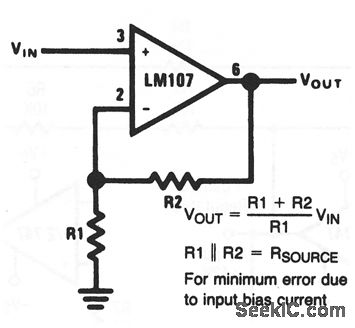 This circuit shows an LM107 that is connected in the classic noninverting amplifier configuration, where VOUT follows VIN The amplitude of the output depends on the ratio of R1 and R2 (within the limits of the supply voltage). The parallel resistance of R1 and R2 should equal the source resistance.
