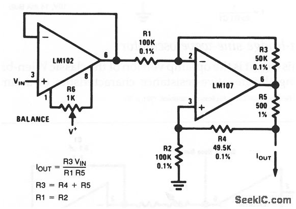 The current output of this circuit depends on the input voltage and the resistance ratios, as shown by the equations. Current output can be trimmed by R6.