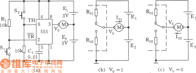 Bistable mode of 555 is applied less commonly compared with monostable mode and nonstable mode. Bistable mode means the circuit it forms will be triggered by pressing R-S. As shown in the figure is micro-motor’s forward/reserve control diagram working under biostable mode.