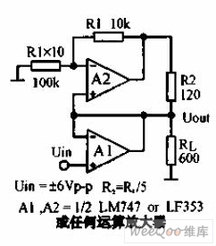 This circuit can realize that the load current is supplied by two op-amp output terminals together equally.A1 and A2 can choose LM747or LF353.Seen from the picture,A2's output voltage is equal to A's 1.1 times,R2 is equal to RL/5.Thus,the current thatflows through R2 is equal to half of the current thatflows through RL。