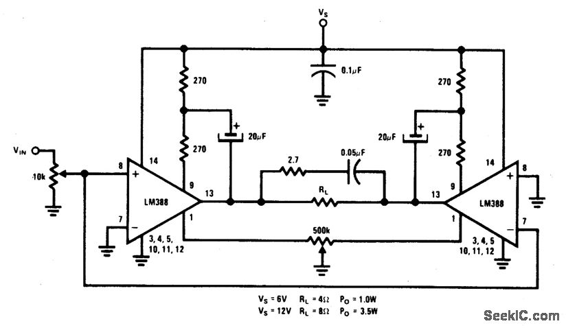 This circuit is for low voltage applications requiring high power outputs. Output power levels of 1.0 W into 4 ohm from 6 V and 3.5 V into 8 ohm from 12 V are typical. Coupling capacitors are not necessary since the output dc levels will be within a few tenths o f a volt of each other. Where critical matching is required the 500 K potentiometer is added and adjusted for zero dc current flow through the load.