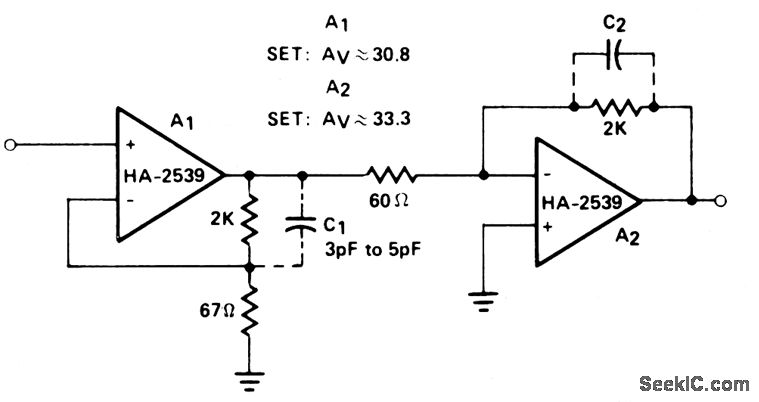 Cascaded amplifter sections are used to extend bandwidth and increase gain. Using two HA-2539 devices, this circuit is capable of 60-dB gain at 20 MHz.