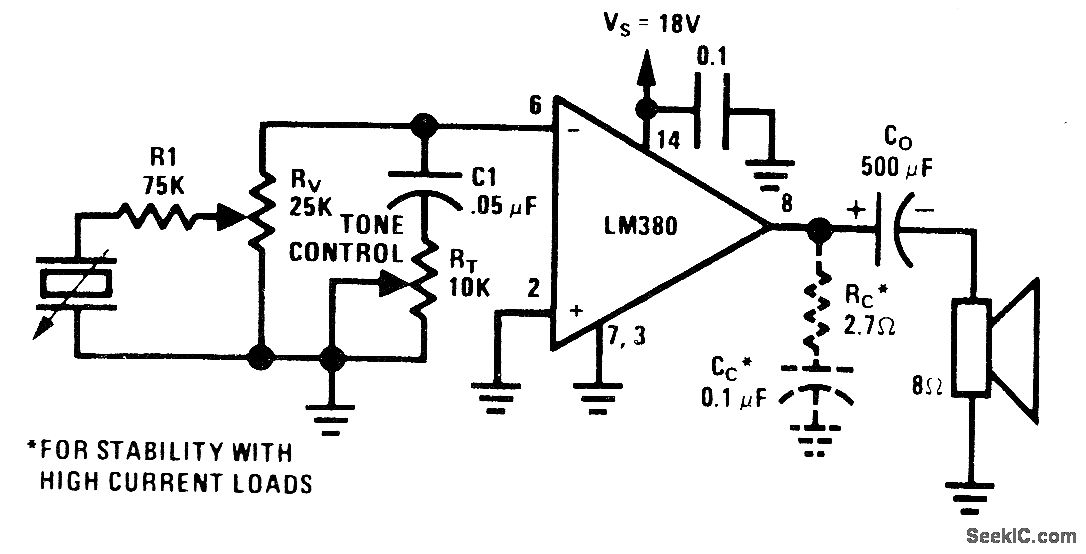 Single National LM380 forms simple amplifier with tone and volume controls for driving 8-ohm loud-speaker at outputs above 3 W. Supply voltage range is 12-22 V, with higher voltage giving higher power. Tone control changes high-frequency rolloff.- Audio Handbook, National Semiconductor, Santa Clara, CA, 1977, p 4-21-4-28.