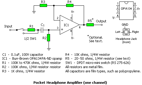 This is a very simple headphone amplifier designed by CMoy.Each channel uses a single Burr-Brown OPA134 opamp in a non-inverting configuration. It has adequate current capability to drive most headphones without an output stage.The amplifier is ideal as a booster for power-conserving stereo sources such as portable CD players and for interfacing with passive EQ networks such as tone controls or a headphone acoustic simulator.