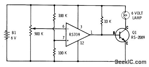 Classroom demonstration circuit for comparator action uses transistor to amplify output of one section of RS339 quad comparator, to boost output currnet rent enough for driving 60-mA lamp. Lamp comes on when voltage at movablearm of 500K pot is greater than half of supply voltage.—F.M. Mims, Integrated Cireuit Projects, Vol. 6, Radio Shack, Fort Worth, TX, 1977, p 33-41.