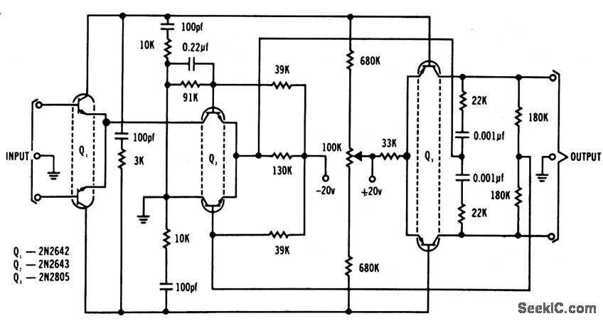 Dual transistors provide extremely high gain, to give greater stability with fewer stages. Circuit has low drift and high common-mode rejection (120 db) for either differential or single-ended outputs. Differential input impedance is 500K minimum, gain-bandwidth product is 5Mc, and low-frequency voltage gain is 68 db.-Texas Instruments Inc Solid-Slate Communications, McGraw-Hill,N.Y.1966, p290.
