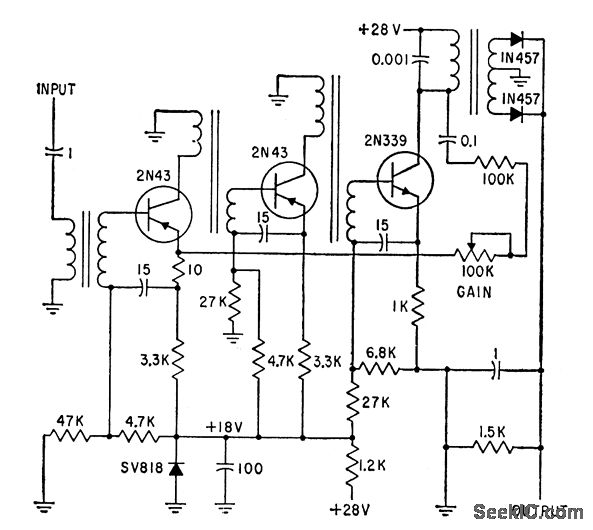Converts output of 20-kc chopper to d-c error signal.Amplifier output is rectified by diodes rather than demodulated,since polarity of error is of no concern.-J.W.Higginbotham and H.H.Douglass.Voltage Comparator with High-Speed Switches,Electronics.32:5,p56-58