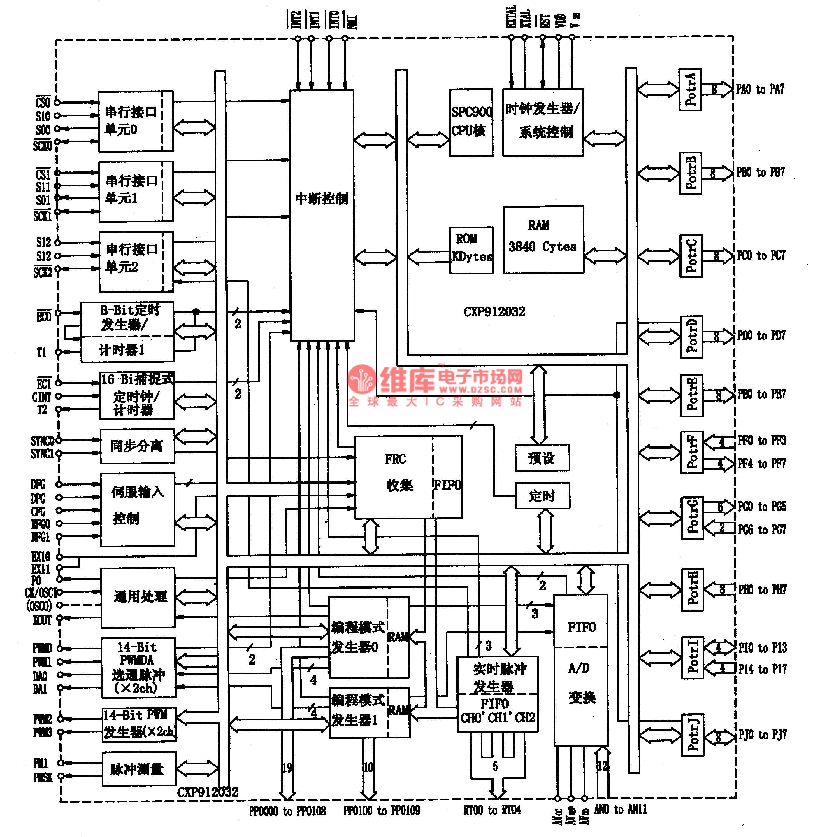 CXP912032 is a 16-bit integrated microcomputer circuit of CMOS single door produced by Sony for KHM-210AAA DVD.1.Function featuresCXP912032 contains 16 bit SPC9O0 CPU, 1281KB ROM and 6144 RAM. And it is also fixed with the series connector unit, 8 bit A/D and D/A transformer, 14 bit PWM, halt controller and servo-controlled circuit and clock circuit, etc.