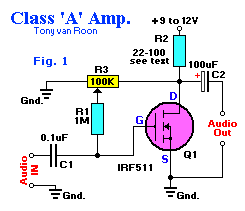 Class-A Audio Amplifier. With zero gate bias applied, Q1 is like switch in the off state, so no current flows through the load resistor R2. Ideally speaking, the voltage across Q1 and the load resistor should be equal for class-A operation. A 100K potentiometer (R3) and a 1-MegaOhm fixed resistor (R1) maker up a simple adjustable gate-bias circuit. Plase a voltmeter between the Drain (D) of Q1 and the circuit ground, and adjust R3 for a meter reading of half the power supply voltage.Almost any resistor value can be used for R2 as long as the maximum current and power ratings of the FET are not exceeded. A resistor value between 22 and 100 ohms is a good choice for experimenting. At high currents, a suitable heat sink should be used.